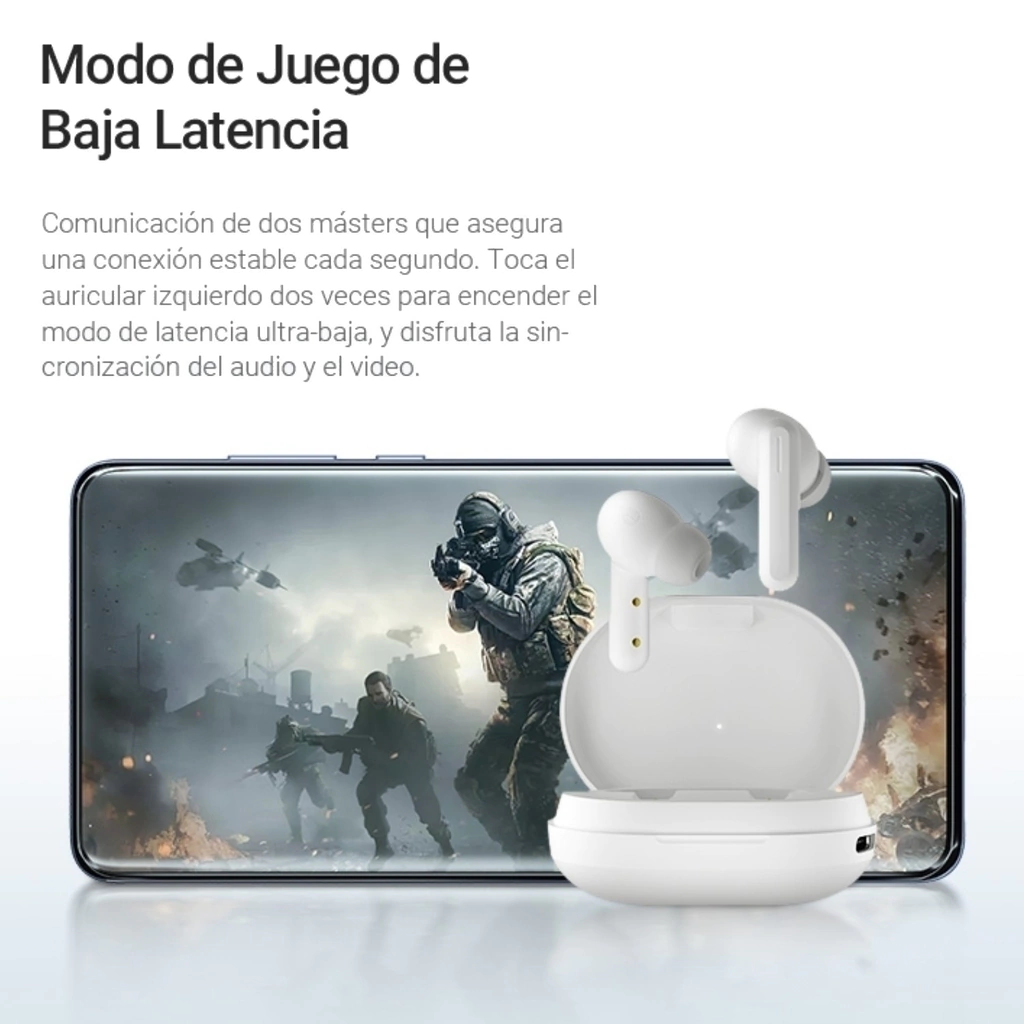 Mientras entrenas, viajas o simplemente te relajas podes controlar tu música desde los auriculares. Con el control táctil podes: pausar, reproducir, cambiar de canción, atender, rechazar o finalizar una llamada, activar el asistente de voz y activar el modo baja latencia